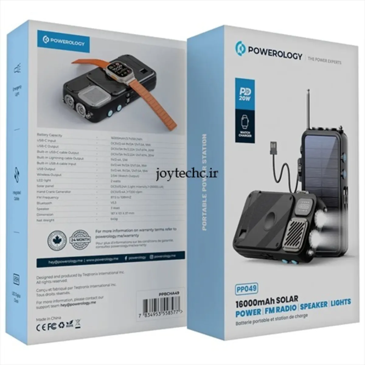پاوربانک خورشیدی پاورولوژی مدل PP049 یک دستگاه همهکاره شامل پاوربانک 16000 میلیآمپر، اسپیکر بلوتوث، رادیو FM، چراغقوه و شارژرهای متنوع است. این محصول با خروجیهای سریع 20W PD و 18W USB-A برای شارژ انواع دستگاهها مناسب است.